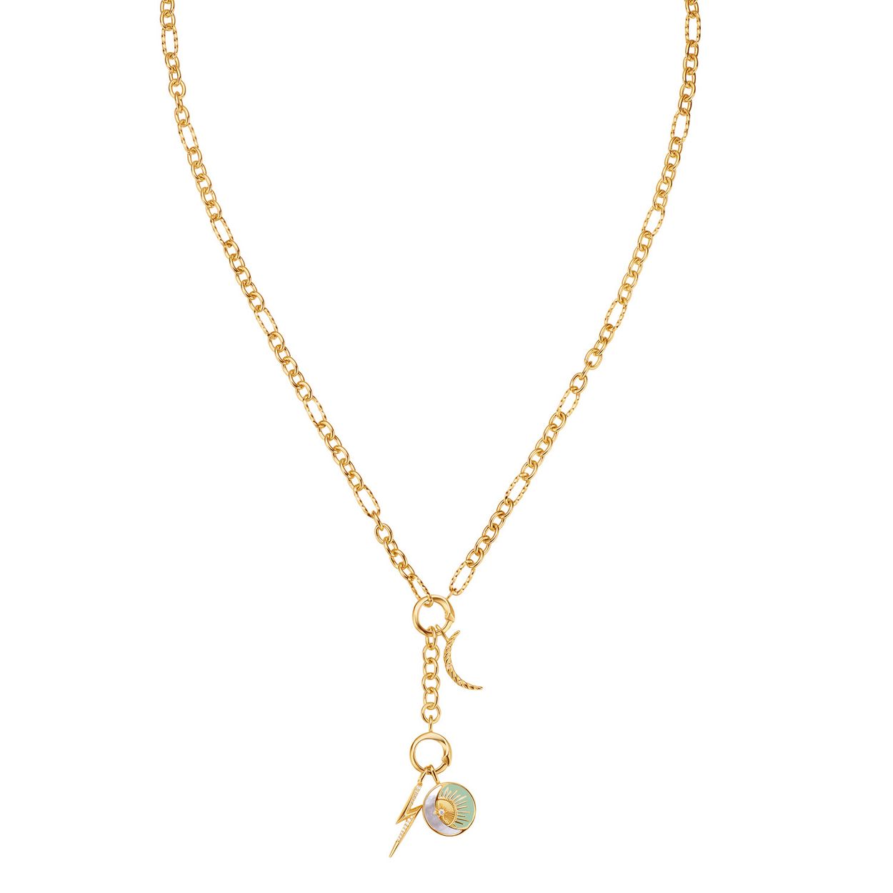Geef je ketting een upgrade met deze kosmische bedel. De chique ronde bedel is gemaakt van 925 sterling zilver met 14 karaat gouden plating. De bedel heeft een halve maan van parelmoer, een vleugje saliegroen email en een  sprankelende zirkonia steen. Bevestig je bedel eenvoudig aan een ketting, armband of connector.