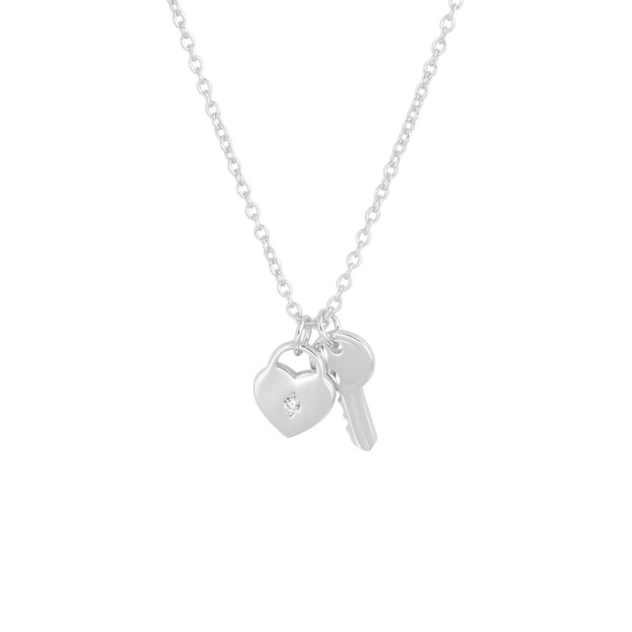 Gerhodineerd 925 zilveren collier uitgevoerd met een hart en een sleutel. Het collier heeft een draaglengte van 41cm met een extensie van 4cm en een stevige karabijn sluiting. Het hart heeft een afmeting van 8.5x7mm. De sleutel heeft een afmeting van 11x5.5mm. De schakelbreedte is 1.2mm.