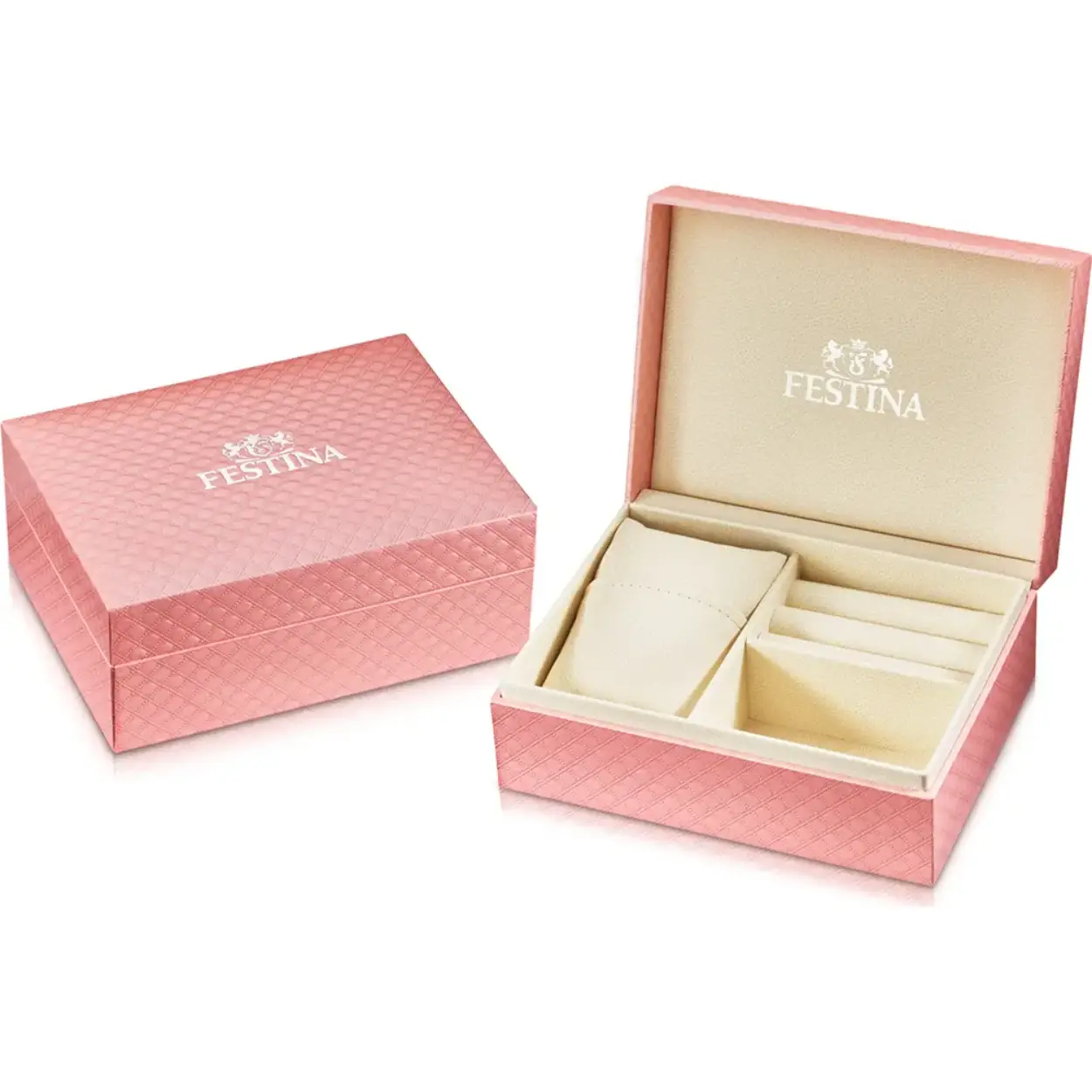 Festina horloge, een Staal zilver kast met een diameter van 38 mm en is voorzien van een metaal band. In de kast bevindt zich een Miyota kwaliteitsuurwerk en is afgewerkt met Mineraalglas.