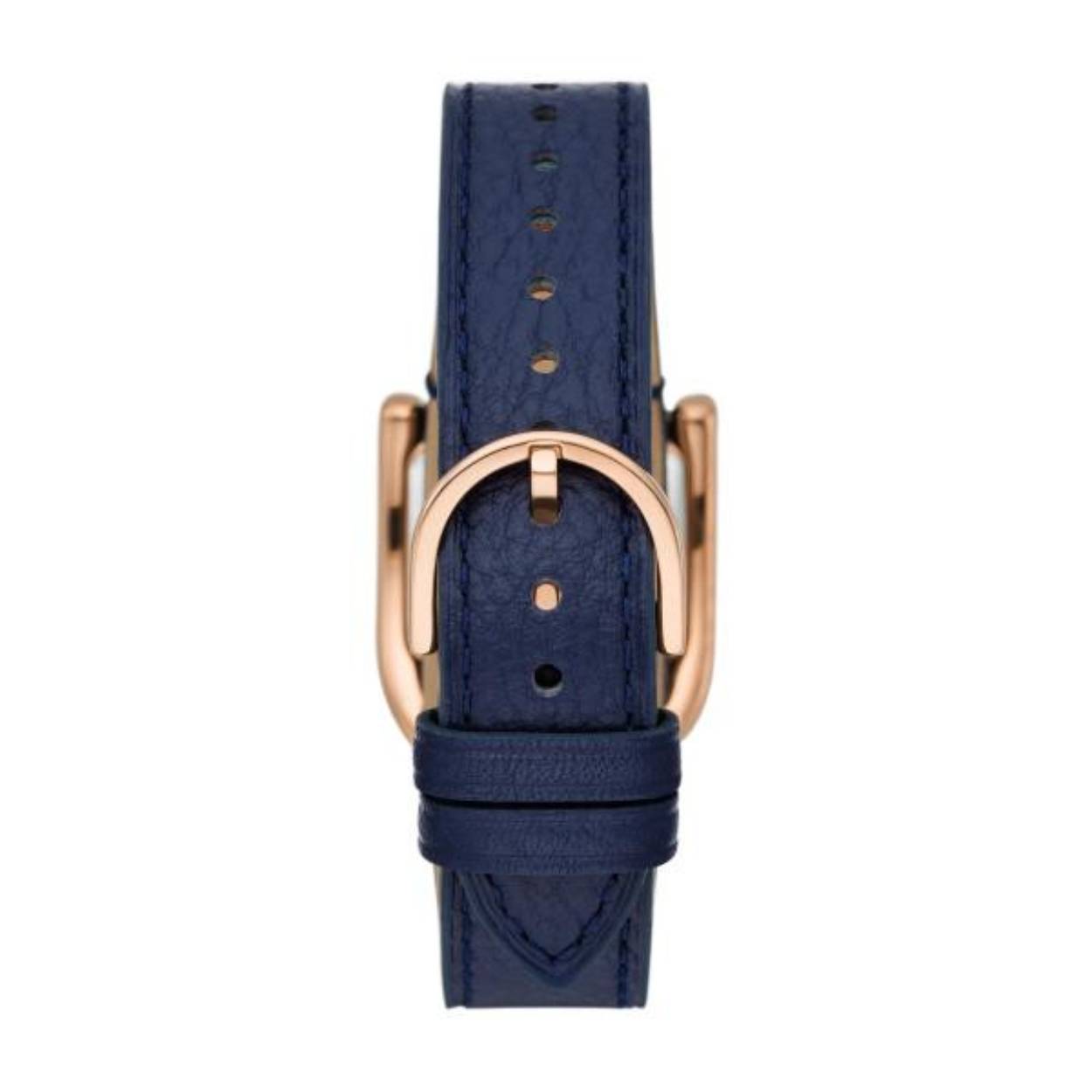 Fossil dames horloge uit de collectie Harwell. Goudkleurig met een donkerblauwe lerenband.