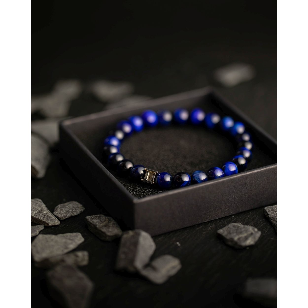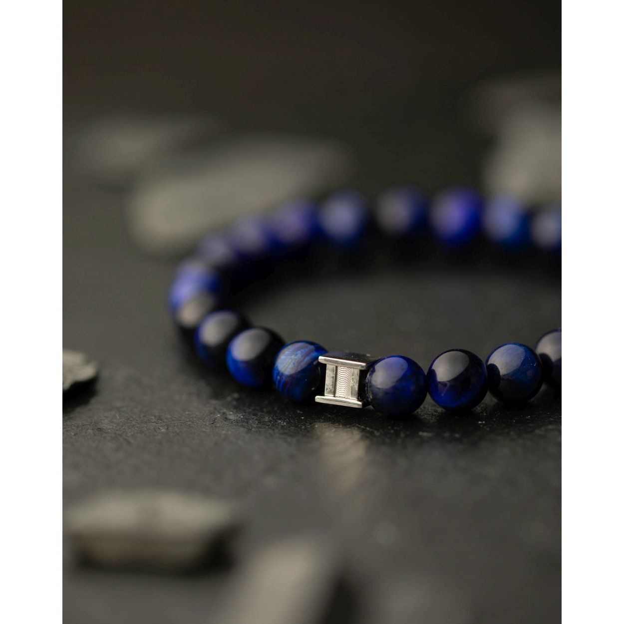 De Gemini Gem Dark Blue herenarmband bestaat uit hoogwaardige, gladde Tiger Eye kralen van hoge kwaliteit. Deze stenen armband is, dankzij de donkere kleur met blauwe glans, ideaal te combineren met alle outfits en kledingstijlen. U kunt een Gemini Gemstone armband gemakkelijk herkennen aan het roestvrije Gemini logo. De Gem-serie bestaat uit 12 verschillende kleuren. De natuursteen Tiger Eye - uit Zuid-Afrika - is een variant op kwarts en wordt gekenmerkt door het kattenoog effect. Het is een bloedversterker, die de kracht en vitaliteit verbetert. - Maat L = 21 cm
