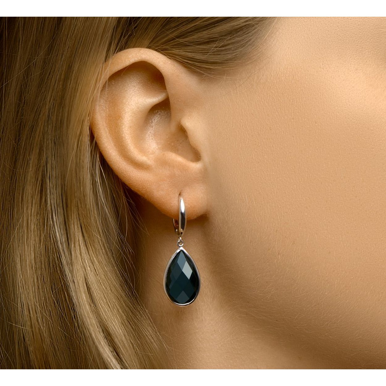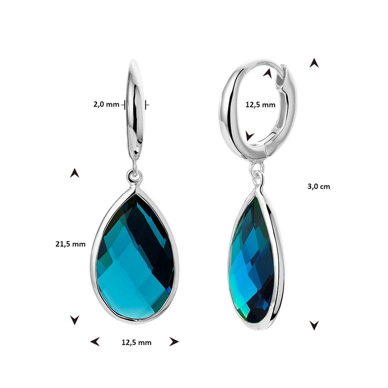 Gerhodineerd 925 zilveren oorringen uitgevoerd met een hanger in druppelvorm met daarin een schitterende synthetisch blauw topaas. De oorringen hebben een totale hoogte van 3cm en een breedte van 12.5mm.