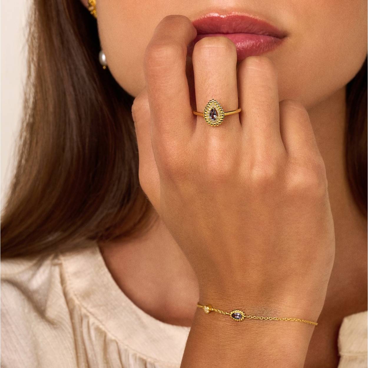 A modern edit of the late princess Diana’s iconic engagement ring, as seen now on Kate Middleton. A deep blue Iolite gemstone in a regal pear cut, graced with 15x glittering white diamonds and holly-like spiked tips. There’s no doubt about it, this statement ring will never fail to stand the test of time and style.
