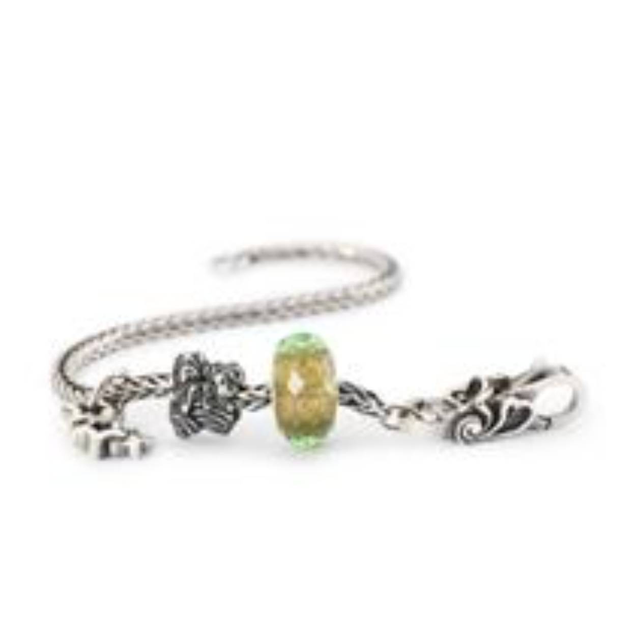 Liefde is een reis die je het beste samen kunt maken. De zilveren armband heeft een zilveren sluiting, versierd met hartjes die over het zilver vloeien. De gefacetteerde glazen kraal schittert in bleekgroen en gouden glitter - de perfecte combinatie voor de twee dennenappels die elkaar omhelzen onder een netjes geknoopte strik. Om de look af te maken, heeft de armband ook een klein kwastje met drie zilveren sterren.